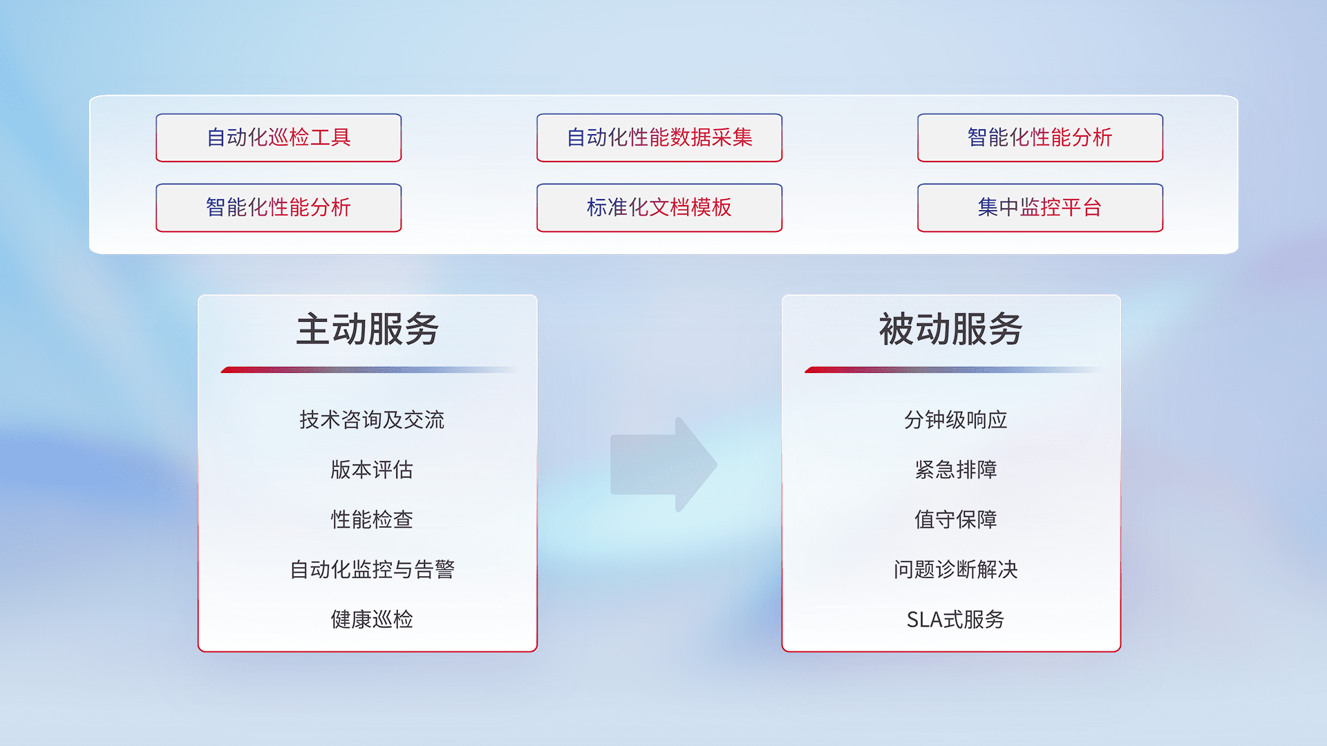 智能化工具和标准化文档,,,保障服务质量,,,提供主动服务(包含技术咨询、、版本评估、、性能检查、、、、自动化监控与告警、、、、健康巡检)和被动服务包含(分钟级响应、、紧急排障、、、、值守保障、、、问题诊断解决、、、、SLA服务)。。。